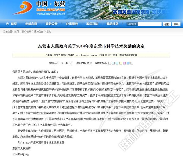 《東營(yíng)市人民(min)政府關(guān)于2014年度(du)東營市(shi)科學技(jì)術獎勵(li)的決定(dìng)》