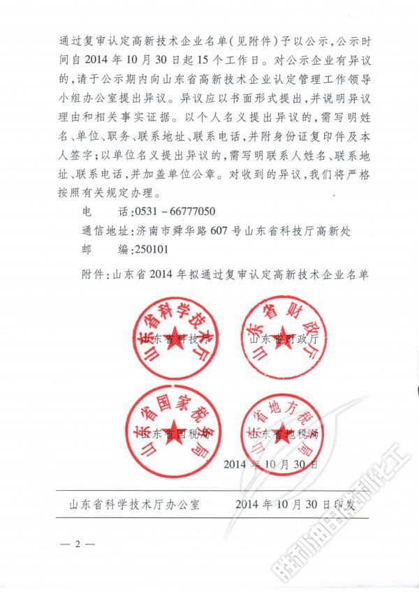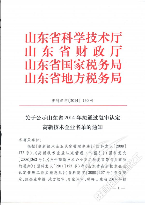 關(guan)于公示山(shān)東省2014年拟(nǐ)通過複審(shen)認定高新(xin)技術企業(ye)名單的通(tong)知