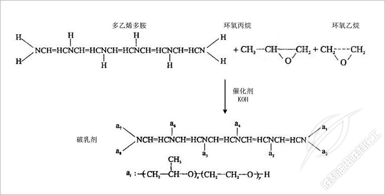 項目以帶(dài)有多個活潑(pō)氫的多乙烯(xi)多胺爲起始(shǐ)劑,在固體KOH催(cuī)化劑作用下(xià)與環氧丙烷(wan)、環氧乙烷聚(jù)合反應制備(bèi)分子量低于(yu)1000的聚醚類破(pò)乳劑,并通過(guò)控制投料比(bi)例制備分子(zi)量在300~500的破乳(ru)劑A和分子量(liàng)在700~900的破乳劑(ji)B。其主要反應(yīng)方程式爲:
