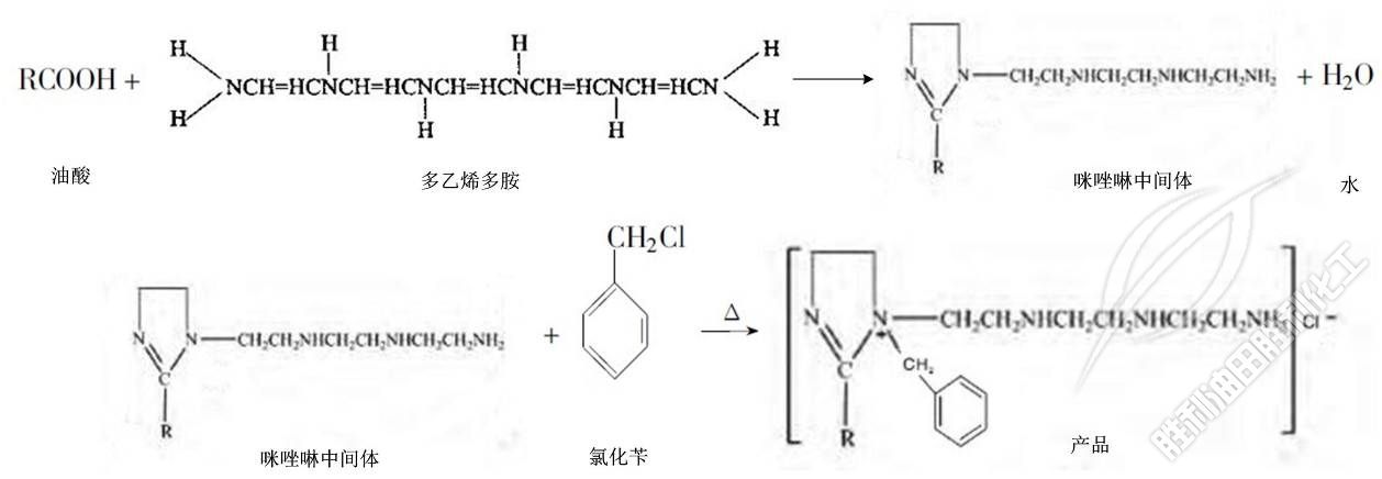采用真空法(fa),以脂肪酸(油(you)酸、蓖麻油、精(jīng)油酸等)與有(you)機胺類(多乙(yǐ)烯多胺、二乙(yi)烯三胺、雜環(huán)胺等)酰胺反(fan)應合成咪唑(zuo)啉中間體,再(zai)與氯化苄季(jì)铵化反應合(he)成咪唑啉型(xíng)緩蝕劑。